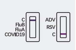 In the SARS-CoV-2/Influenza A virus/Influenza B virus/Respiratory syncytialvirus/Adenovirus detection window, two dark blue/purple lines appear in the (C) section and no line appears in the detection area (COVID-19/Flu A/Fu B/ADV/RSV). It indicates that SARS-CoV-2, Influenza A virus, Influenza B virus, Respiratorysyncytial virus or Adenovirus was not detected in the sample.