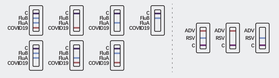 Adenovirus (ADV) positve:Two coloured lines appear in the ADV/RSV test window. A dark blue/purple Iine is in the(C) section and a red line is in the (ADV) section.